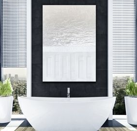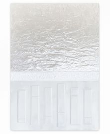 Heavy texture, shimmer white paint, sand texture, white stained glass and shiny resin on wood panel