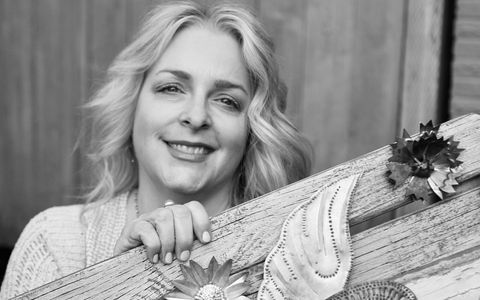 “I love the simplicity and beauty of folk art! It expresses so much while remaining accessible for everyone to make and enjoy. I hope the lively color, texture, pattern and whimsy draw you in and leave you with a feeling of delightful reflection. As I work, a word or phrase often emerges that tells the story and finds its way into my finished piece. I love the spark of joy that comes from creative discovery and I try to convey that in my art.”