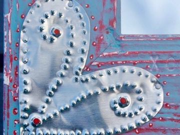 Fencepost caps find second life as backdrops for these sweetheARTS. Featuring hand punched tin, drawer pulls, recycled beads, words of love and affection.