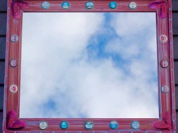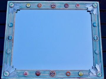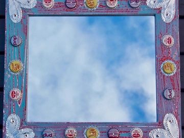 Multi layer hand painted wood frame mirror embellished with hand punched tin, vintage metal embellishments, bottle caps and the word "SMILE" punched into the side of the frame.
